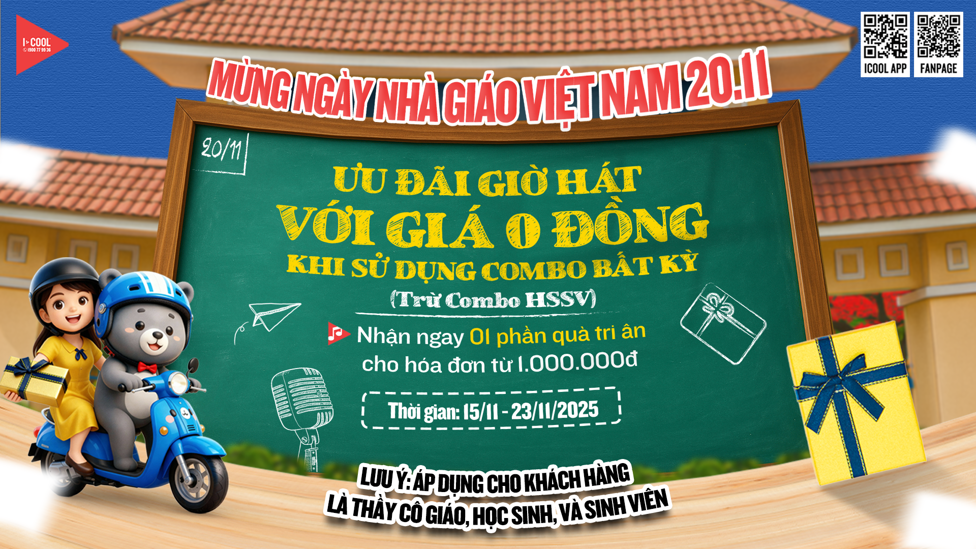 Ngày Nhà giáo Việt Nam 20/11 sắp tới là dịp đặc biệt để chúng ta gửi lời tri ân sâu sắc đến thầy cô, những người đã gieo mầm xanh tri thức trong hành trình tuổi trẻ. Hãy cùng ICOOL tổ chức một buổi họp lớp thật ý nghĩa và “khác xưa” – khi phòng hát không chỉ là nơi giải trí mà còn là không gian gắn kết cảm xúc, khơi gợi ký ức tuổi học trò qua những ưu đãi cực kỳ hấp dẫn: